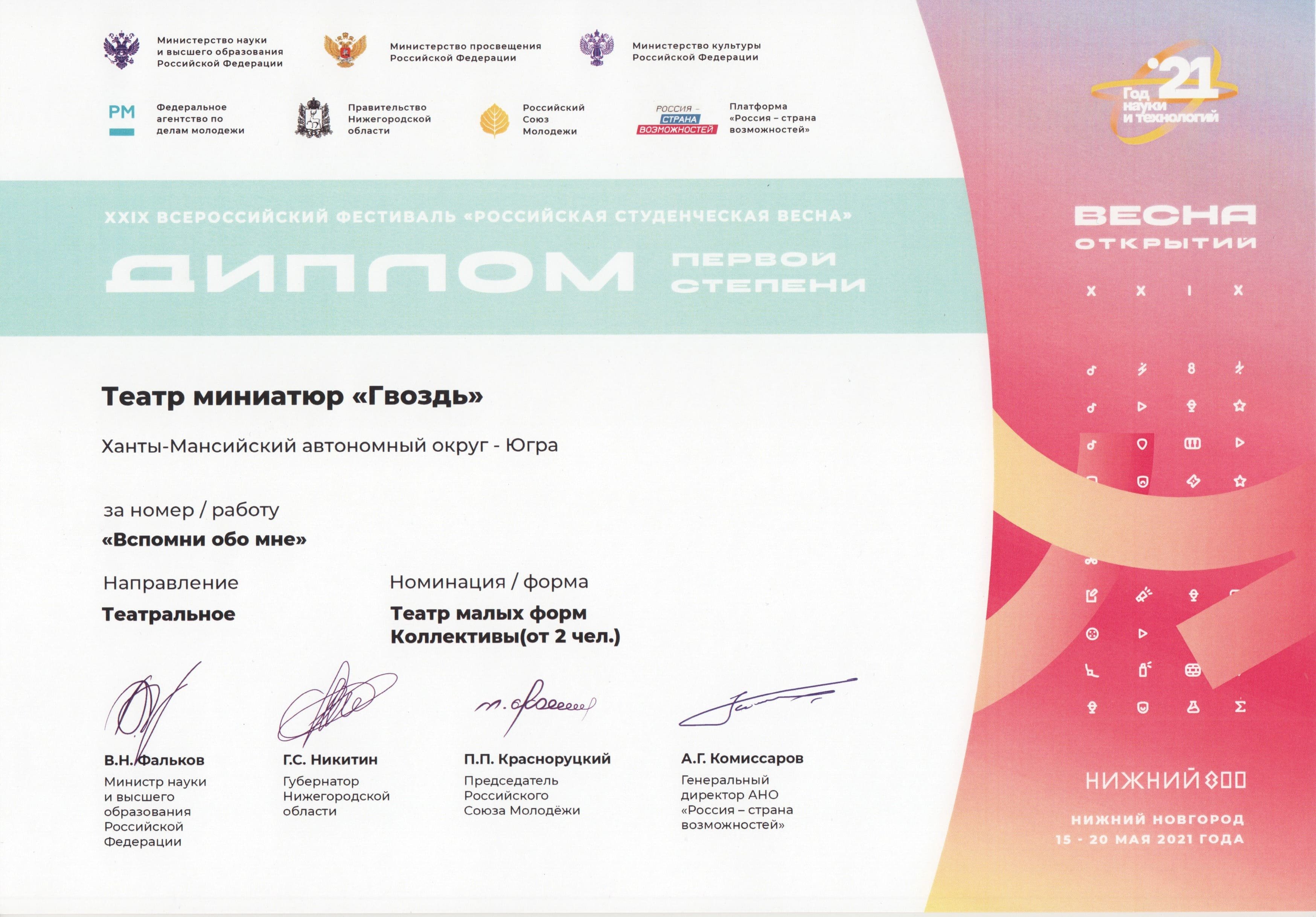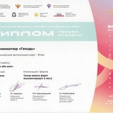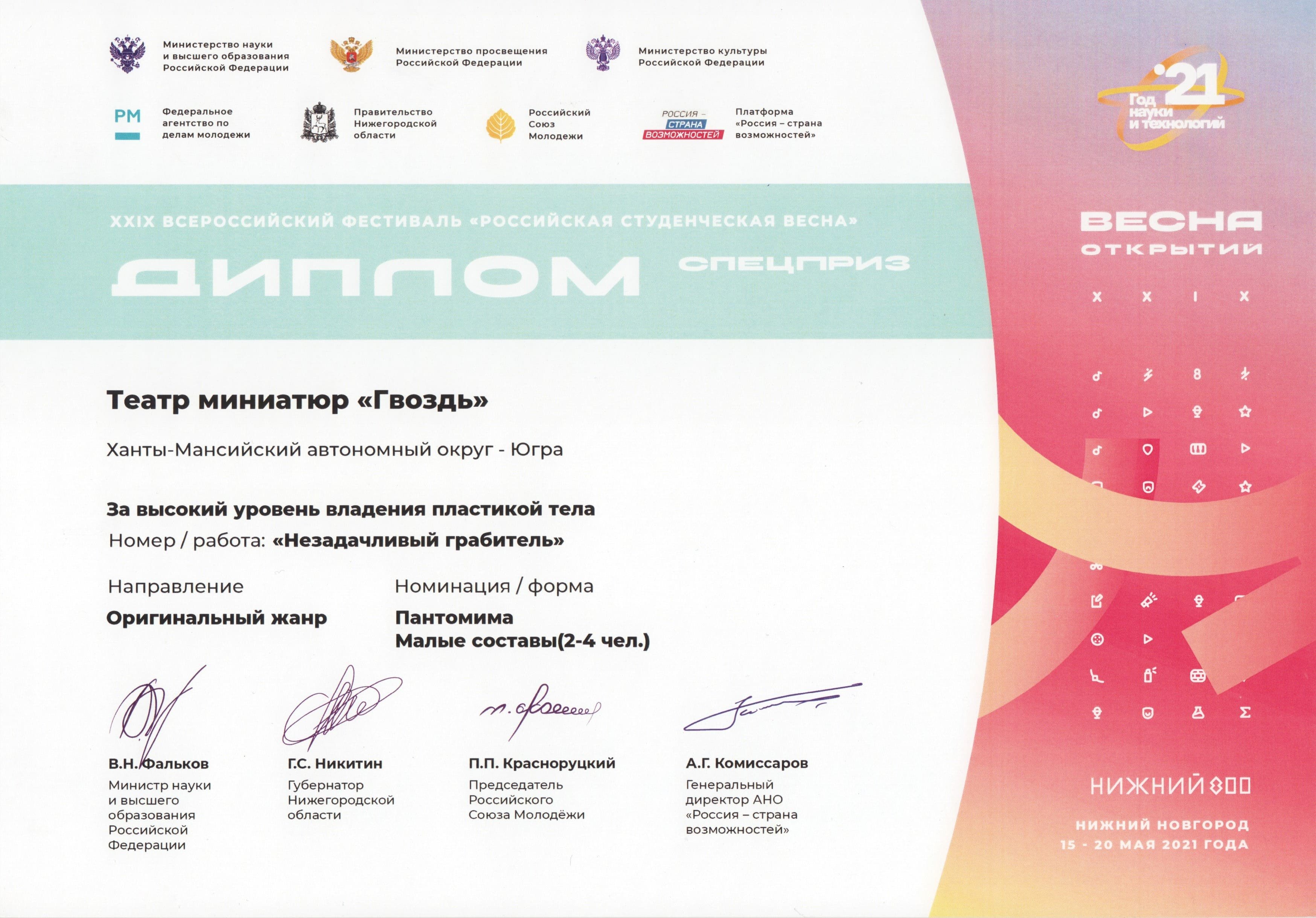 Студенческий театр миниатюр «Гвоздь» завоевал сразу две награды – первое место за постановку «Вспомни обо мне» и специальный приз за пантомиму «Незадачливый грабитель». «В этом году на фестивале было рекордное количество участников и конкурсных номеров. И задача победить была не из простых. Театр миниатюр «Гвоздь» показывал два номера в двух конкурсных направлениях. В направлении «Театр» мы сделали пластический спектакль «Вспомни обо мне», посвященный теме Великой Отечественной войны. В направлении «Оригинальный жанр» – веселую пантомиму «Незадачливый грабитель». В направлении «Театр» у нас возникли дополнительные сложности: нас поместили в профильную группу, на том основании, что участники спектакля учатся на режиссерском отделении. А к профильной группе у жюри всегда особые требования. Но несмотря на все сложности и конкурс в группе профессионалов, театр миниатюр «Гвоздь» стал лауреатом I степени. В направлении «Оригинальный жанр» театр тоже выступил удачно. Актеры театра Олег Раздобреев и Мария Зубарева получили специальный приз «За высокий уровень владения пластикой тела», – прокомментировал заслуженный деятель культуры Югры – художественный руководитель и режиссер театра Виктор Проскуряков.