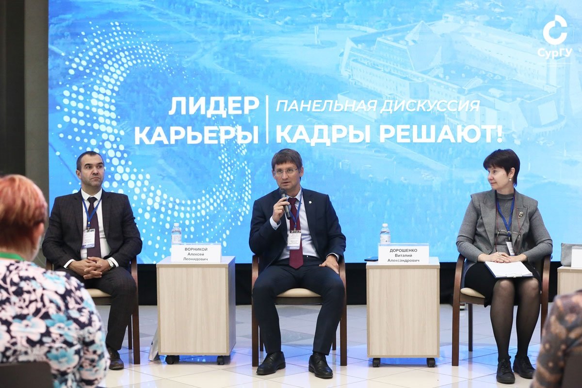 Спикеры открытого диалога: начальник инженерно-технического центра ООО «Газпром трансгаз Сургут» Алексей Ворникой; управляющий Югорским отделением ПАО «Сбербанк» Виталий Дорошенко; заместитель начальника департамента управления персоналом и организационного проектирования – начальник отдела развития персонала и социальных программ АО «Россети Тюмень» Ольга Харисова; проректор по учебно-методической работе СурГУ Елена Коновалова.