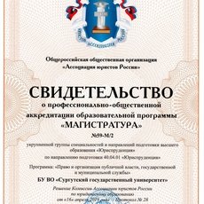 Комиссия по юридическому образованию Общероссийской общественной организации «Ассоциация юристов России» 16 апреля 2019 года (протокол №28) аккредитовала магистерские программы БУ ВО «Сургутский государственный университет» по направленности (профилю)