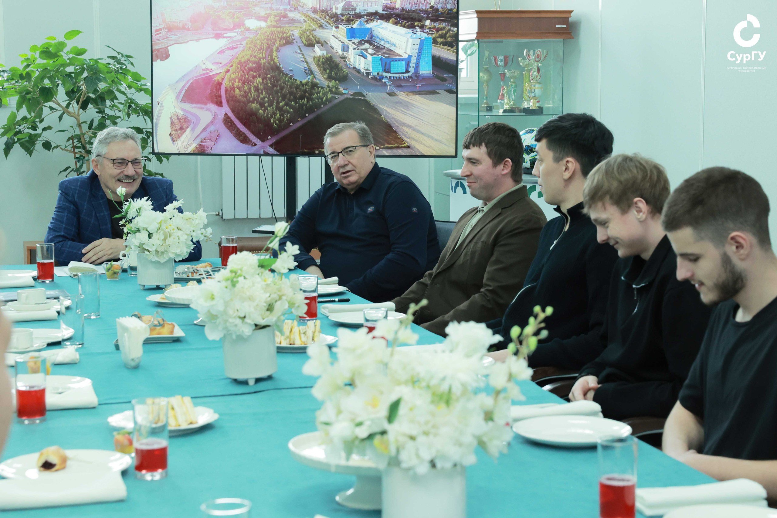 В честь головокружительной победы наших спортсменов 10 апреля в СурГУ прошла встреча команды по футзалу с ректором. В формате чаепития, на котором присутствовали проректор по молодежной политике Святослав Болотов, а также отдел по спортивно-массовой работе СурГУ, игроки университетской сборной обменялись историями с соревнований и воспоминаниями о прошедших играх, обсудили различные аспекты спорта, поделились дальнейшими планами, рассказали о забавных ситуациях из жизни. Сергей Михайлович обратил внимание студентов на то, что, несмотря на такое высокое достижение, нельзя забывать об учебе – нужно развиваться всесторонне. Он также подчеркнул, что спортивная история вуза богата яркими достижениями, а имена спортсменов – выходцев из СурГУ – стали известны как в Югре, так и за ее пределами, среди них даже есть участники и чемпионы Олимпийских игр.