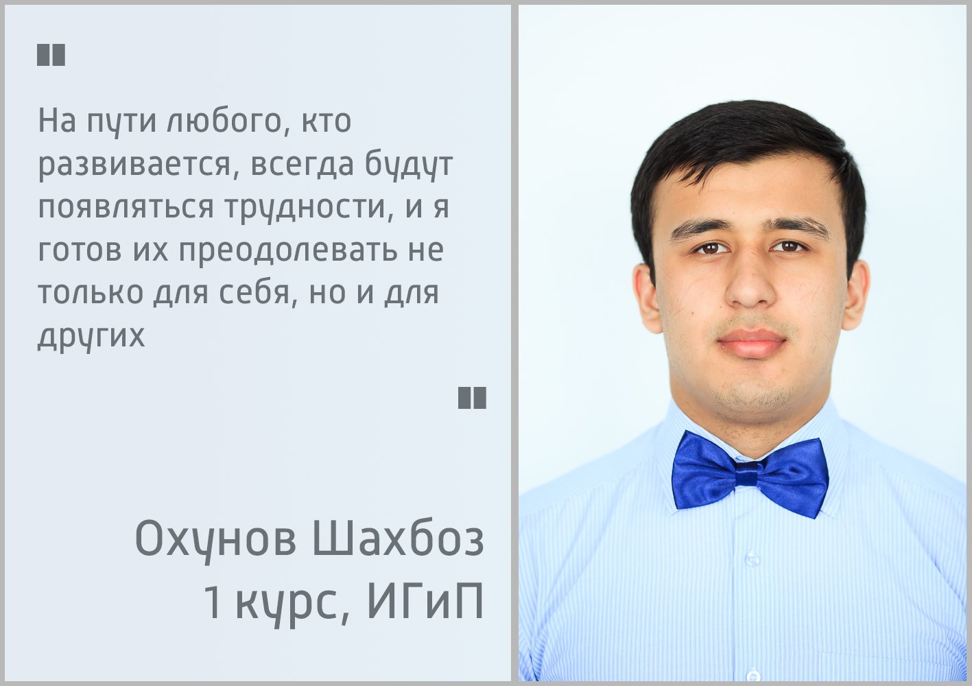МИ — Анна Утюмова, 3-й курс, группа 501-45; ИЕиТН — Вадим Бекчив, 1-й курс, группа 306-61; ПИ — Никита Усенков, 1-й курс, группа 604-61; ИГОиС — Мария Стяжкина, 1-й курс, группа 208-61 (б); ИГиП — Шазбоз Охунов, 1-й курс, группа 102-63; ИЭиУ — Анар Аляров, 2-й курс, группа 403-51.