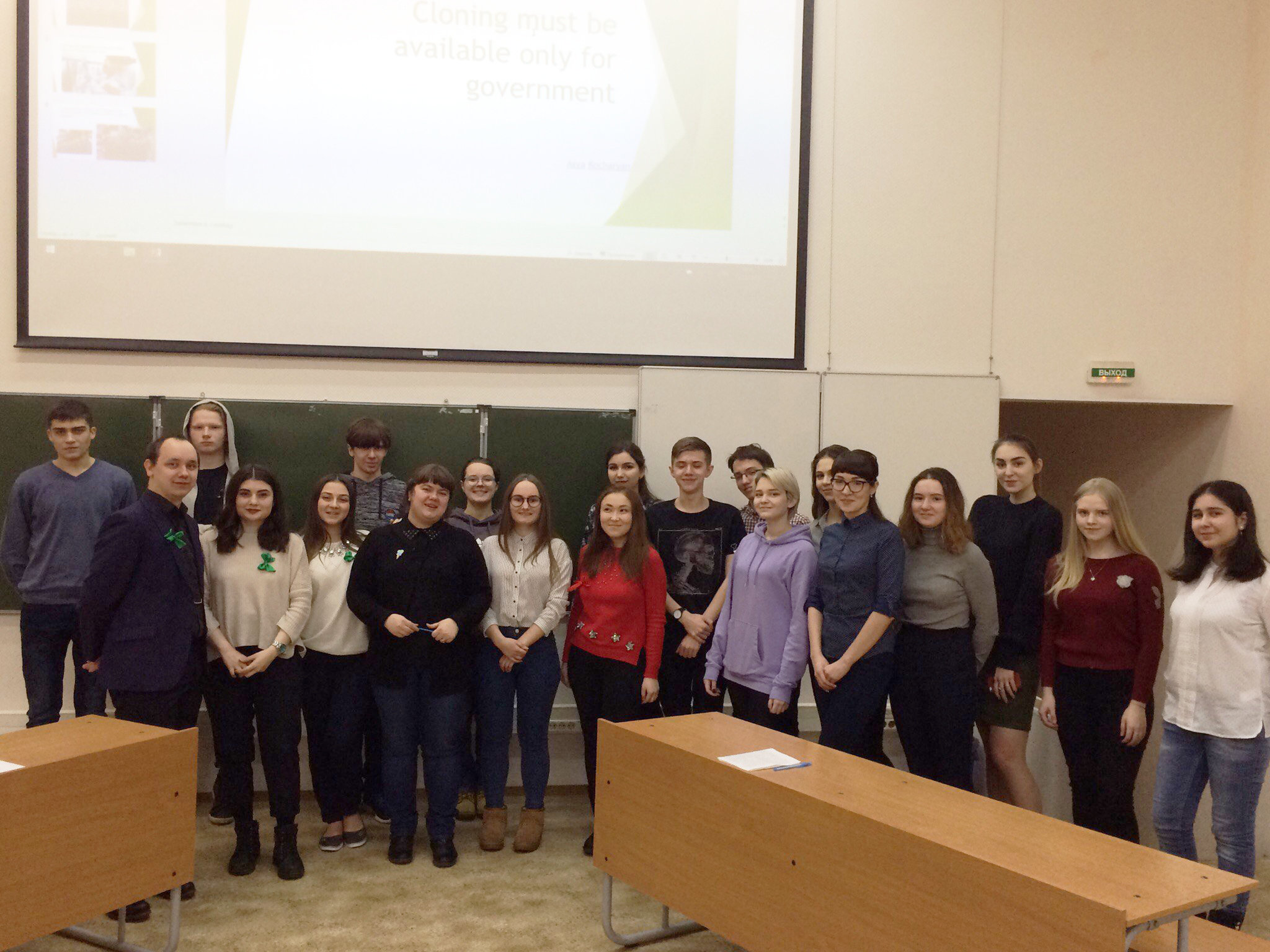 Очередное заседание было посвящено идее клонирования в современном мире. Шесть участников были разделены на две команды: зеленых («за») и красных («против»). Пункты, которые обсуждали ребята, касались этичности клонирования животных и людей, а также вопросу должно ли клонирование стать общедоступным.