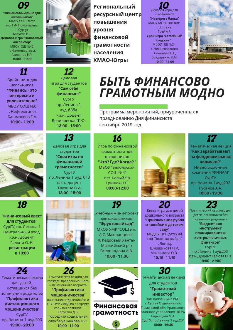 Региональный ресурсный центр финансовой грамотности населения Ханты-Мансийского автономного округа – Югры, понимая всю важность системного воспитания успешного гражданина своей страны, в рамках празднования Дня финансиста в России подготовил ряд мероприятий, охватывающих различные возрастные и целевые группы населения, в том числе целевая группа населения, склонная к рискованному типу финансового поведения в сложных обстоятельствах – дети, оставшиеся без попечения родителей и целевая группа населения, испытывающая трудности при реализации своих прав на финансовое образование и их защиту – граждане пенсионного и предпенсионного возраста.