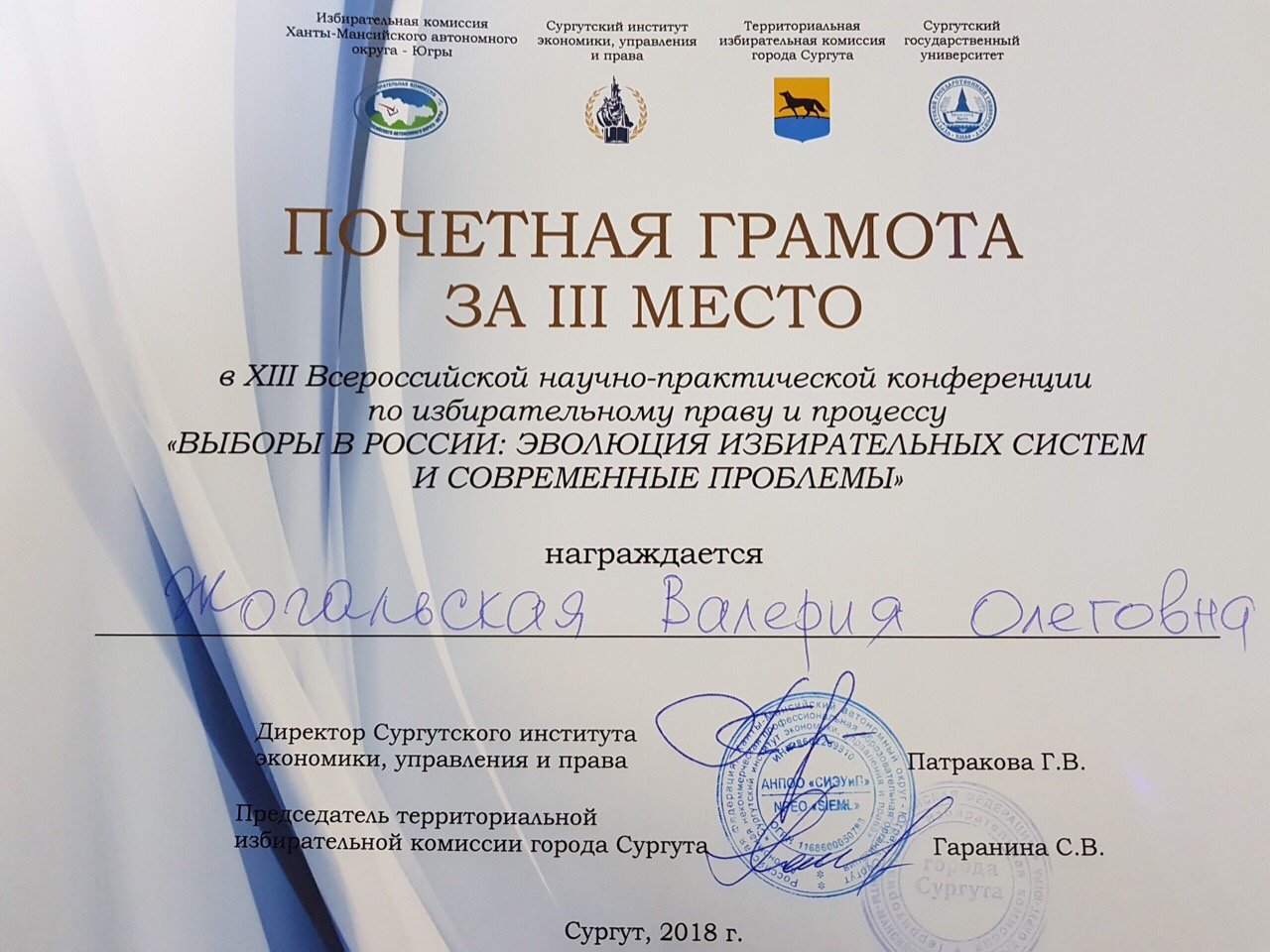 Напомним, XIII научно-практическая конференция проходила на базе Сургутского института экономики, управления и права в октябре прошлого года. Студентка СурГУ Валерия Жогальская, чья фотография уже второй семестр подряд опубликована на Доске Почета, выступала в секции: «Современные проблемы избирательного права и процесса», где заняла третье место. И останавливаться на достигнутом третьекурсница не собирается: «Впереди еще много научных трудов, а значит предстоит большая и кропотливая работа!»