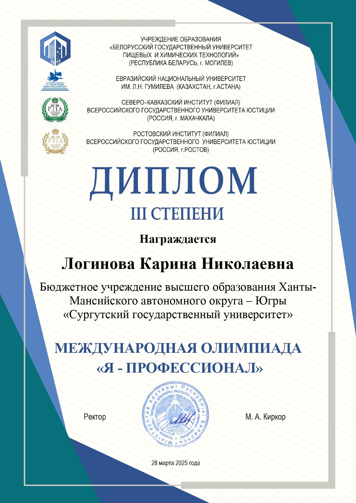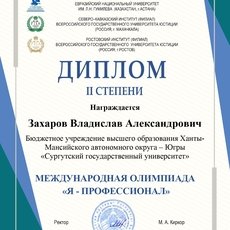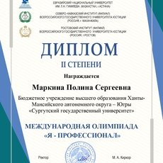 По предложению заведующей кафедрой менеджмента и бизнеса в олимпиаде на тему «Анализ хозяйственной деятельности» приняли участие студенты Сургутского государственного университета направления «менеджмент». Дипломами международной олимпиады «Я – профессионал» II степени оценены результаты студентки 3 курса Маркиной Полины и Захарова Владислава – студента 4 курса. Дипломы III степени: Ханова Валерия, Логинова Карина, Мирончик Елизавета – студентки 3 курса.